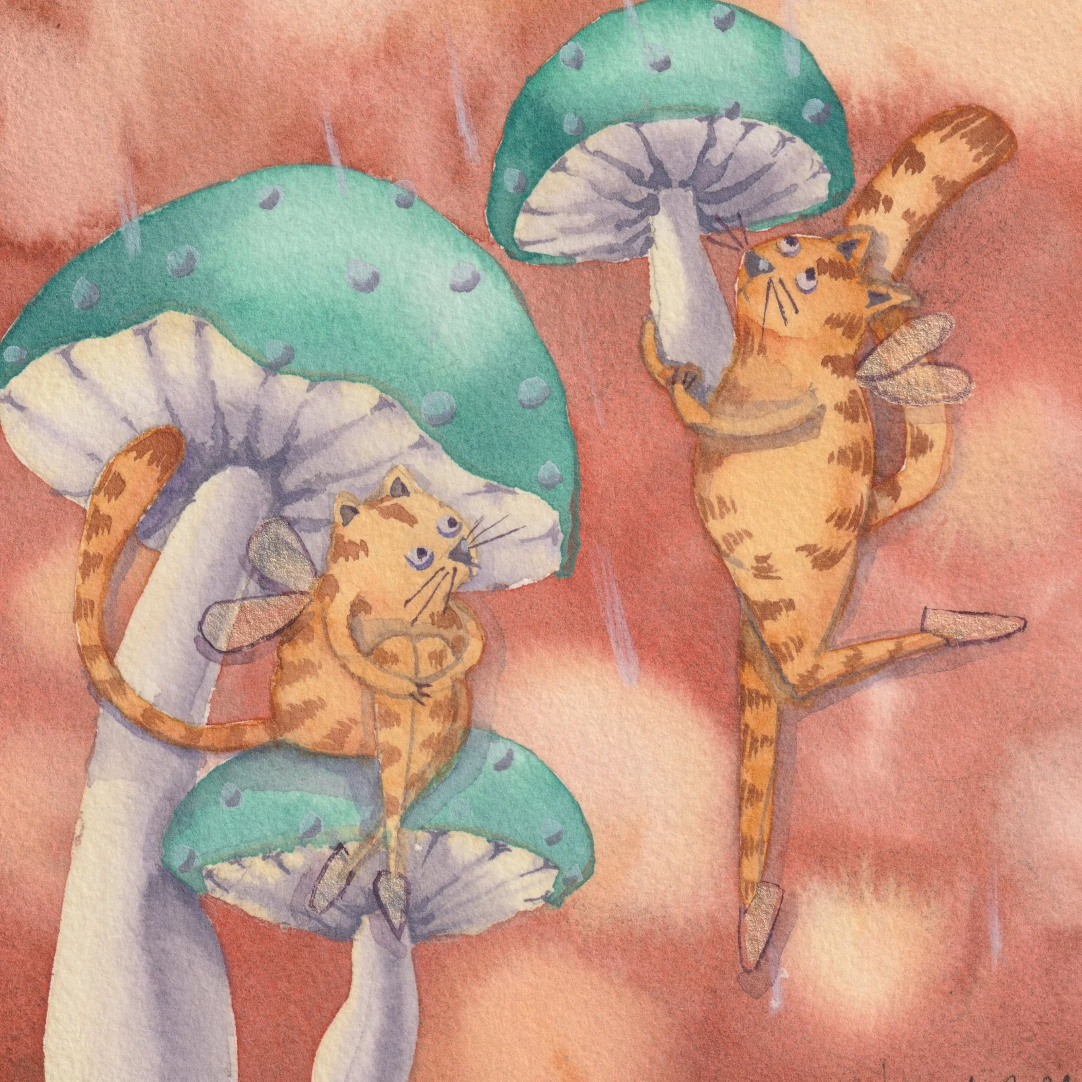 MomaLino (Jen Gallagher’s art collective- I am Jen!) is the home of all things whimsical and playful, knitted and watercolored. I express my joy in this medium of watercolor through the painting of fantastical creatures in every day life along with my favorite, dancing cats.